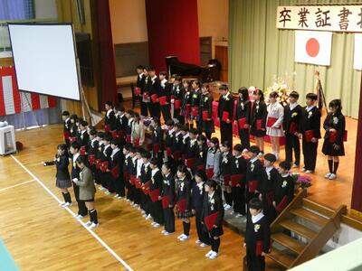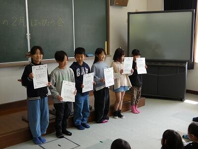 各クラスの代表児童が校長先生から修了証を受け取りました。校長先生から「この修了証は1年間の努力を認める大事なもの」というお話があり、子どもたちも自分たちの1年間のがんばりを振り返っているようでした。