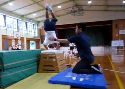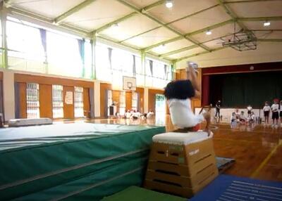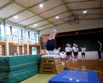 今では、ほとんどの子が段差のあるところで前転ができるようになり、中には、膝を伸ばした「伸膝台上前転」や、体を反らせてはねる「頭はね跳び」ができるようになった子もいます。