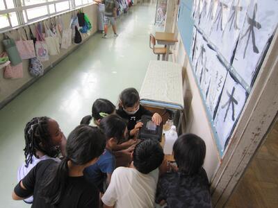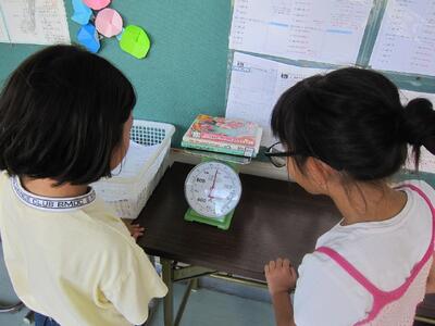 算数では「重さ」の学習をしています。廊下にはいろいろな「はかり」が置いてあり、通りかかった子が物をのせて量っています。この子たちは、ぴったり1㎏になったときには思わず飛び跳ねて喜んでいました。
