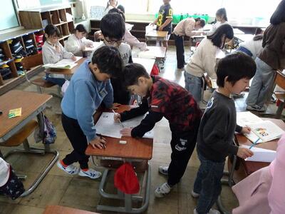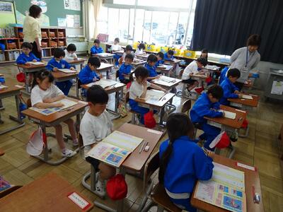 1年生は書写の学習で、自分の名前を丁寧に書いていました。これからの学習を通して、最初に書いた字と1年生の終わりの字を比べることができるのが楽しみです。学習の中では、「先生、字がうまいな~」という声も聞こえ、教室には和やかな笑いが広がっていました。