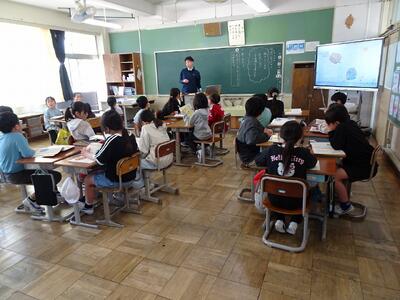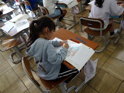 4年生は理科と道徳の学習に取り組んでいました。理科では、天気による気温の変化の違いをグラフに表し、その特徴を考えていました。「正しくグラフにかけたかな?」と、先生と一緒に確認しながら、丁寧に学習を進めている様子が見られました。